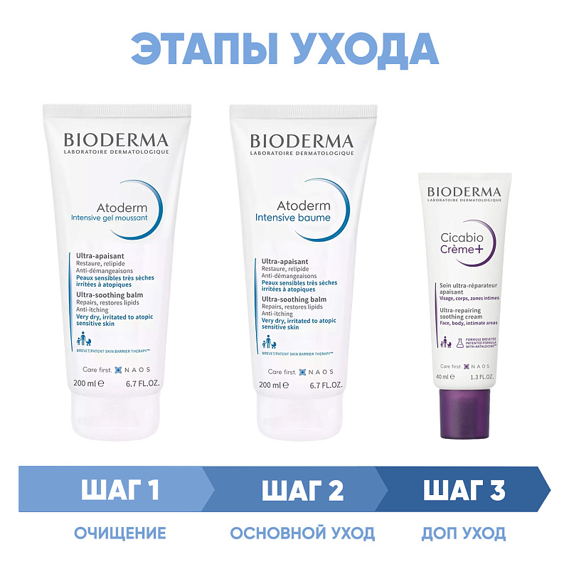 ПРОГРАММА КОМПЛЕКСНОГО УХОДА Bioderma Atoderm для ухода за атопичной, сухой, очень сухой и чувствительной кожей лица и тела. Комплексный уход - это дополняющие друг друга средства, совместное использование которых будет максимально эффективным. Первым шагом такой программы всегда является очищение. Вторым - основной уход, а третьим - дополнительный уход.