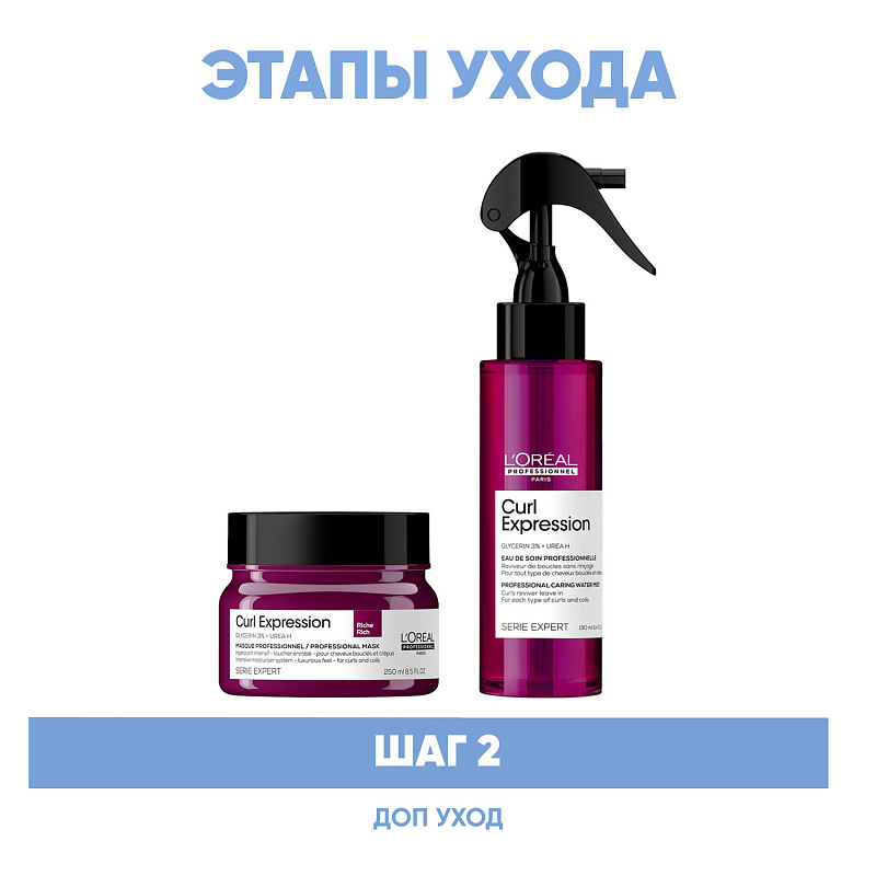 ПРОГРАММА КОМПЛЕКСНОГО УХОДА L'Oreal Professionnel Curl Expression для кудрявых и волнистых волос. Комплексный уход представляет собой дополняющие друг друга средства, совместное использование которых будет максимально эффективным. Первым шагом программы является базовый уход (очищение + питание), вторым – дополнительный уход (средства, усиливающие эффект базовой программы и применяемые постоянно или периодически).