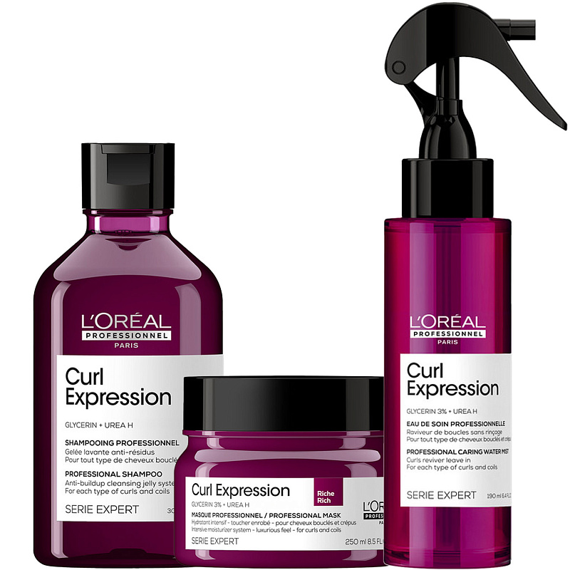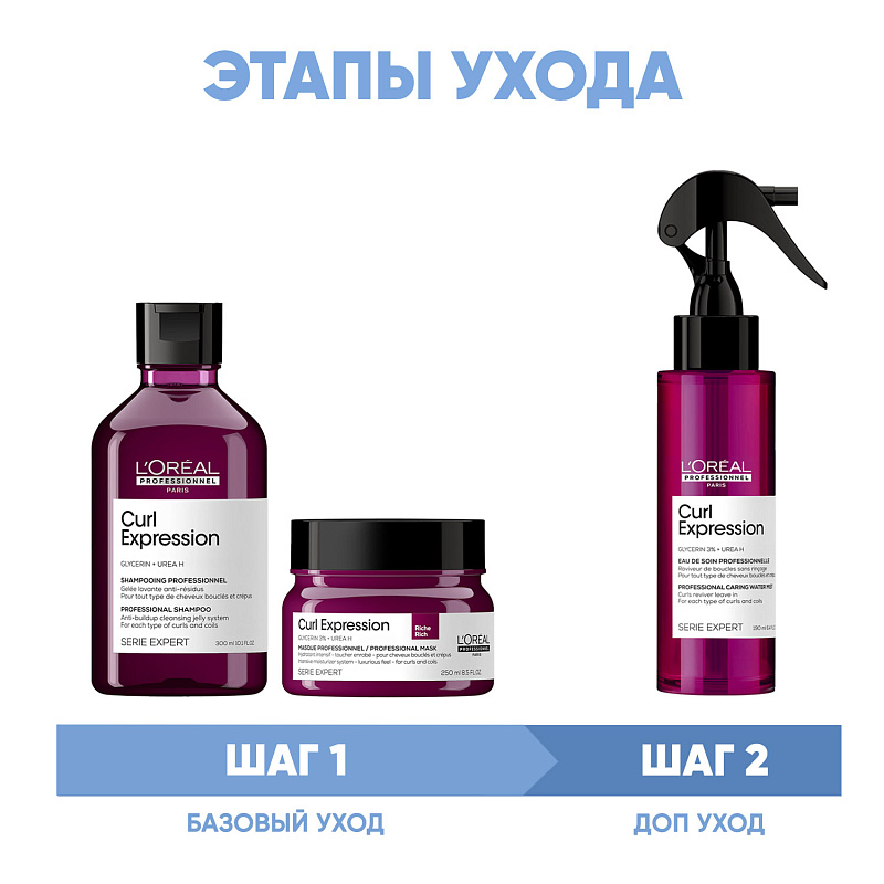 ПРОГРАММА КОМПЛЕКСНОГО УХОДА L'Oreal Professionnel Curl Expression для кудрявых и волнистых волос. Комплексный уход представляет собой дополняющие друг друга средства, совместное использование которых будет максимально эффективным. Первым шагом программы является базовый уход (очищение + питание), вторым – дополнительный уход (средства, усиливающие эффект базовой программы и применяемые постоянно или периодически).
