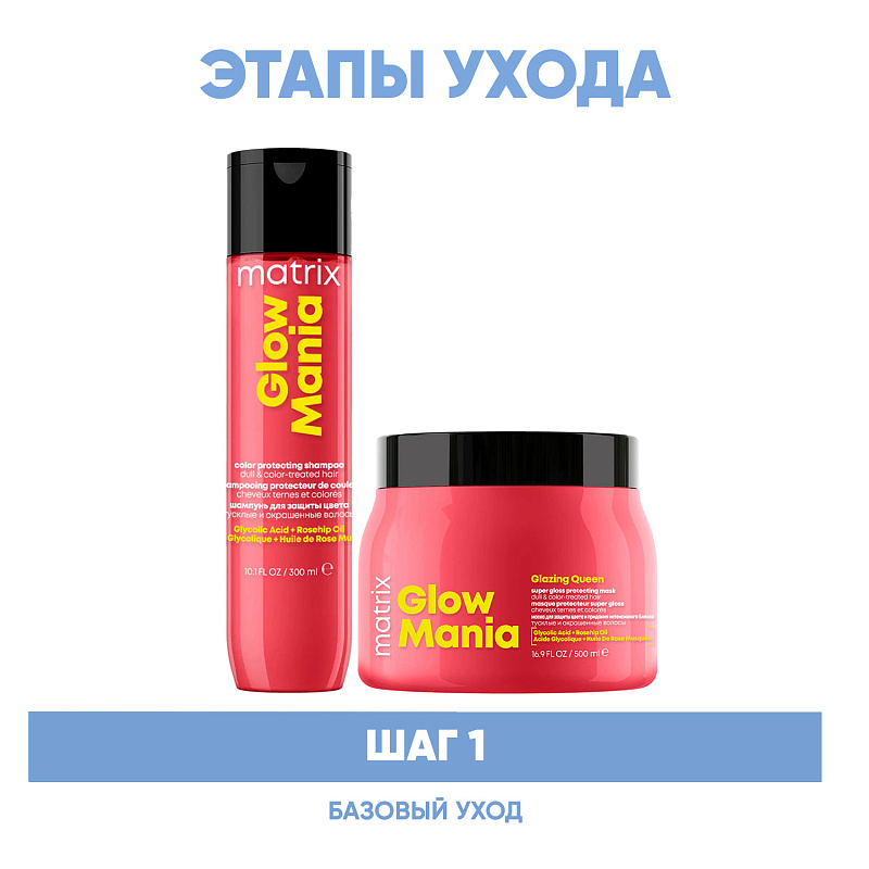 ПРОГРАММА КОМПЛЕКСНОГО УХОДА Matrix Glow Mania для окрашенных и тусклых волос. Комплексный уход представляет собой дополняющие друг друга средства, совместное использование которых будет максимально эффективным. Первым шагом программы является базовый уход (очищение + питание), вторым – дополнительный уход (средства, усиливающие эффект базовой программы и применяемые постоянно или периодически).