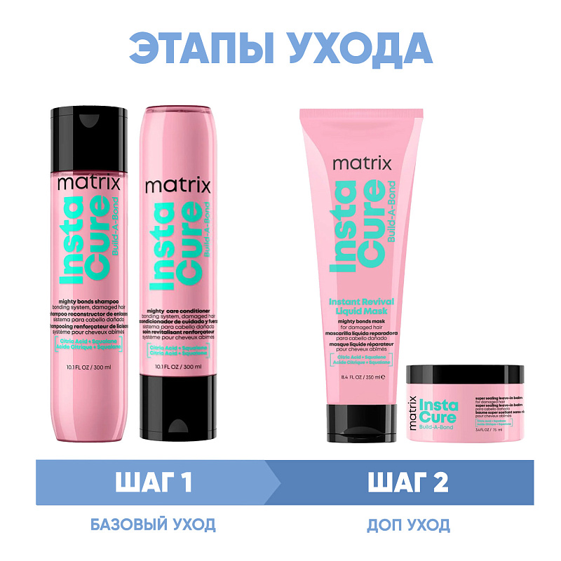 ПРОГРАММА КОМПЛЕКСНОГО УХОДА Matrix Instacure Build-A-Bond для поврежденных волос. Комплексный уход представляет собой дополняющие друг друга средства, совместное использование которых будет максимально эффективным. Первым шагом программы является базовый уход (очищение + питание), вторым – дополнительный уход (средства, усиливающие эффект базовой программы и применяемые постоянно или периодически).