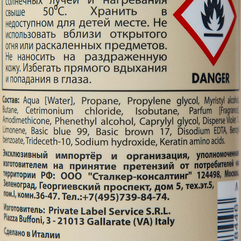 Состав: aqua [water], propane, propylene glycol, myrisyl alcohol, butane, cetrimonium chloride, isobutane, parfum [fragrance], phenethyl alcohol, caprylyl glycol, disperse violet 1, limonene, basic blue 99, basic brown 17, disodium edta, benzyl benzoate, trideceth-10, sodium hydroxide, keratin amino acids.