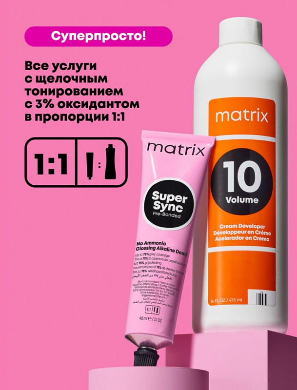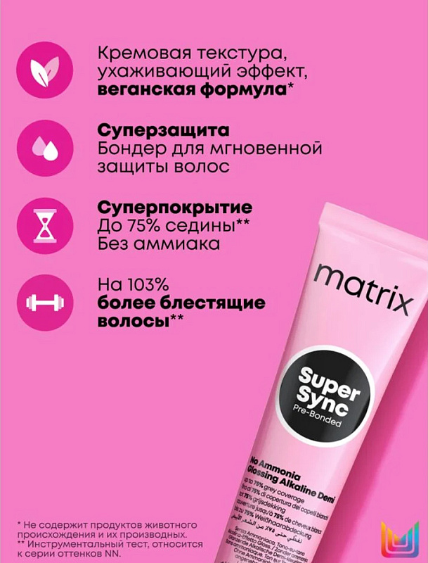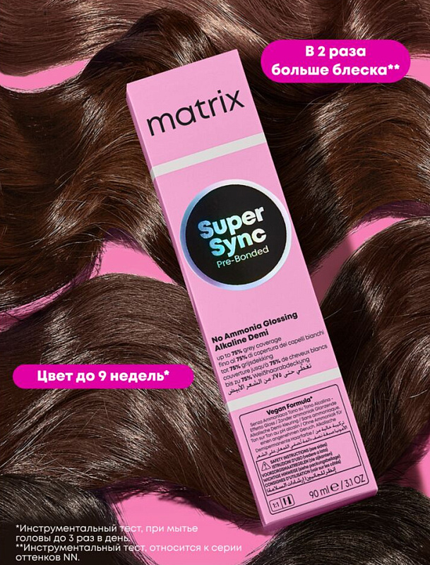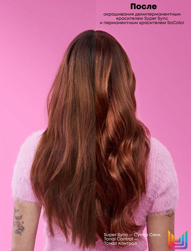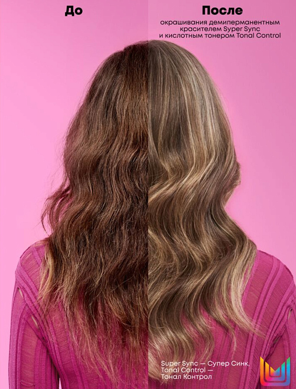 Super Sync идеален для тонирования после осветления порошком. Технология поднимает натуральную базу до 1/2 уровня тона. Краситель эффективно перекрывает до 75% седины*. Благодаря новому бондеру в составе красителя вы сможете сохранить качество волос окрашивание за окрашиванием. Технология придает волосам глянцевый блеск. обеспечивает легкость расчесывания по всей длине.