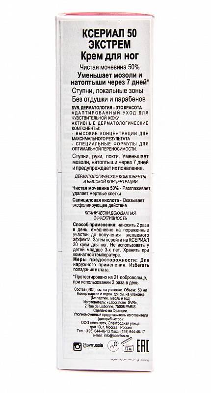 Наносите SVR Xerial 50 Extreme Crème Pieds каждый день на пораженные участки до исчезновения проявлений. В качестве поддерживающего ухода используйте SVR Ксериал 30 крем для ног.