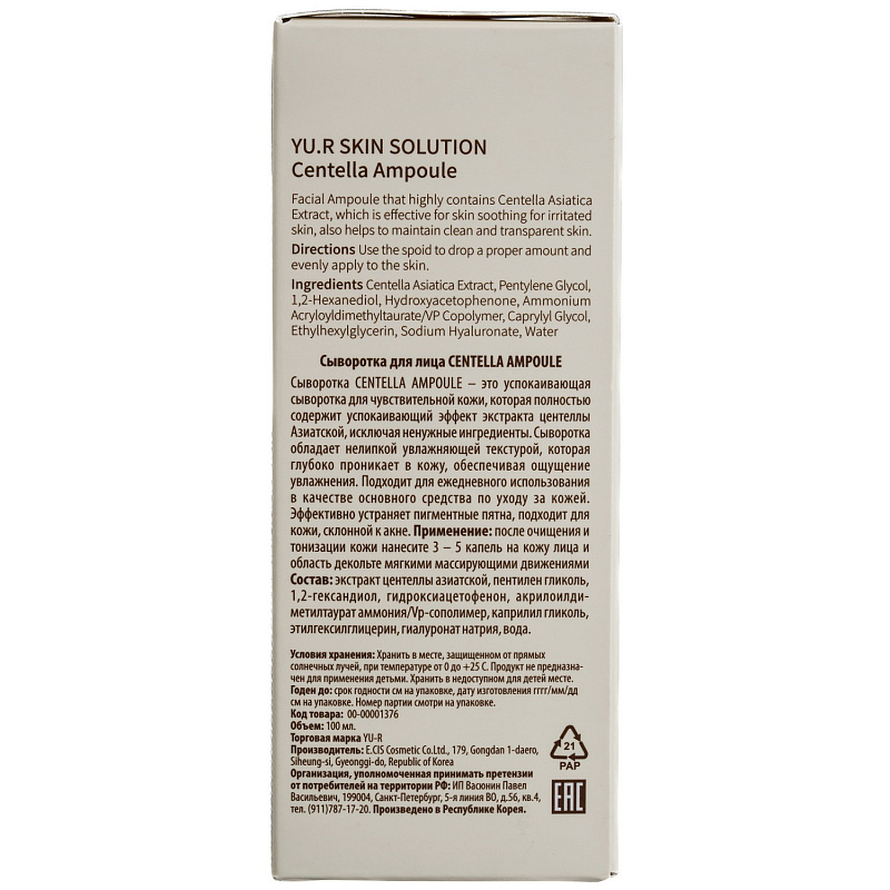 Состав: экстракт центеллы азиатской, пентилен гликоль, 1,2-гександиол, гидроксиацетофенон, акрилоилдиметилтаурат аммония/Vp-сополимер, каприлил гликоль, этилгексилглицерин, гиалуронат натрия, вода.