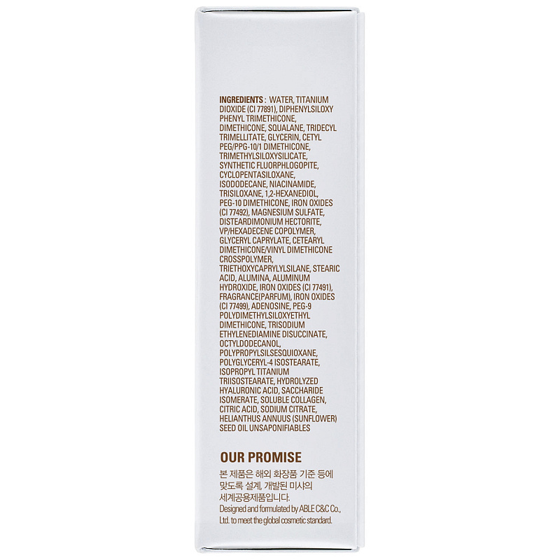 Состав: Water, Titanium Dioxide (CI 77891), Diphenylsiloxy Phenyl Trimethicone, Dimethicone, Squalane, Tridecyl Trimellitate, Glycerin, Cetyl PEG/PPG-10/1 Dimethicone, Trimethylsiloxysilicate, Synthetic Fluorphlogopite, Cyclopentasiloxane, Isododecane, Niacinamide, Trisiloxane, 1,2-Hexanediol, PEG-10 Dimethicone, Iron Oxides (CI 77492), Magnesium Sulfate, Disteardimonium Hectorite, VP/Hexadecene Copolymer, Glyceryl Caprylate. Cetearyl Dimethicone/Vinyl Dimethicone Crosspolymer, Triethoxycaprylylsilane, Stearic Acid, Alumina, Aluminum Hydroxide, Iron Oxides (CI 77491), Fragrance(Parfum), Iron Oxides (CI 77499), Adenosine, PEG-9 Polydimethylsiloxyethyl Dimethicone, Trisodium Ethylenediamine Disuccinate, Octyldodecanol, Polypropylsilsesquioxane, Polyglyceryl-4 Isostearate, Isopropyl Titanium Triisostearate, Hydrolyzed Hyaluronic Acid, Saccharide Isomerate, Soluble Collagen, Citric Acid, Sodium Citrate, Helianthus Annuus (Sunflower) Seed Oil Unsaponifiables.