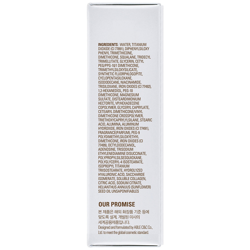 Состав: Water, Titanium Dioxide (CI 77891), Diphenylsiloxy Phenyl Trimethicone, Dimethicone, Squalane, Tridecyl Trimellitate, Glycerin, Cetyl PEG/PPG-10/1 Dimethicone, Trimethylsiloxysilicate, Synthetic Fluorphlogopite, Cyclopentasiloxane, Isododecane, Niacinamide, Trisiloxane, 1,2-Hexanediol, PEG-10 Dimethicone, Iron Oxides (CI 77492), Magnesium Sulfate, Disteardimonium Hectorite, VP/Hexadecene Copolymer, Glyceryl Caprylate. Cetearyl Dimethicone/Vinyl Dimethicone Crosspolymer, Triethoxycaprylylsilane, Stearic Acid, Alumina, Aluminum Hydroxide, Iron Oxides (CI 77491), Fragrance(Parfum), Iron Oxides (CI 77499), Adenosine, PEG-9 Polydimethylsiloxyethyl Dimethicone, Trisodium Ethylenediamine Disuccinate, Octyldodecanol, Polypropylsilsesquioxane, Polyglyceryl-4 Isostearate, Isopropyl Titanium Triisostearate, Hydrolyzed Hyaluronic Acid, Saccharide Isomerate, Soluble Collagen, Citric Acid, Sodium Citrate, Helianthus Annuus (Sunflower) Seed Oil Unsaponifiables.