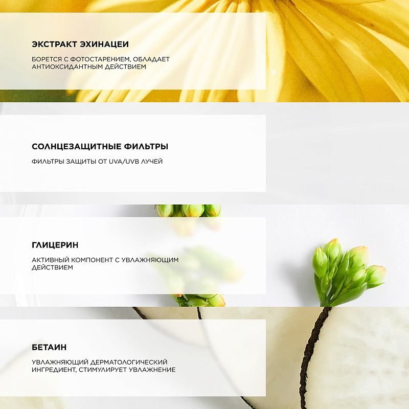 - экстракт эхинацеи предотвращает фотостарение, оказывает антиоксидантное действие
