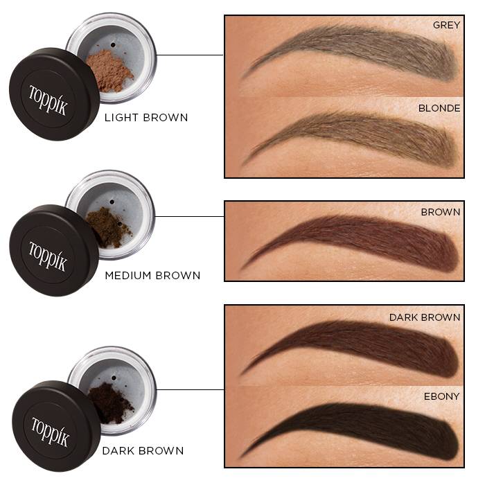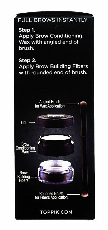 Нанести воск для придания четкой формы бровям, затем с помощью двухсторонней кисти нанести пудру по линии каждой брови. Кисть следует регулярно промывать после использования.У палитры Toppik три универсальных цвета пудры загустителя, посмотрев на палитру вы сможете подобрать себе наиболее близкий к вашему естественному цвету бровей.
