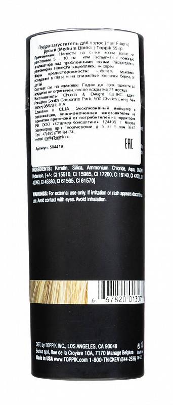 Загуститель для волос Toppik – это косметическая пудра для мужчин и женщин, которая помогает маскировать залысины и добавлять объем истонченным волосам. Пудра для объема волос легко наносится, не осыпается и практически незаметна на волосах. Средство подходит для любых типов волос – седых или проблемных, а также при окрашивании или в сочетании с другими косметическими средствами.