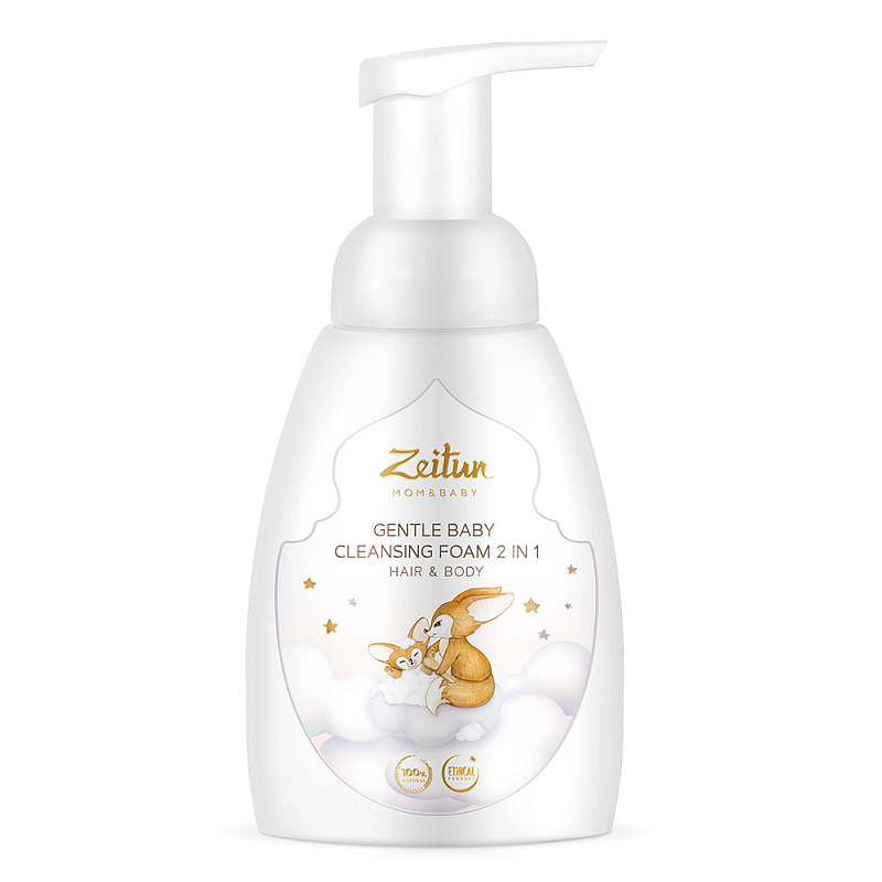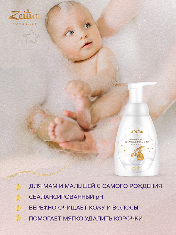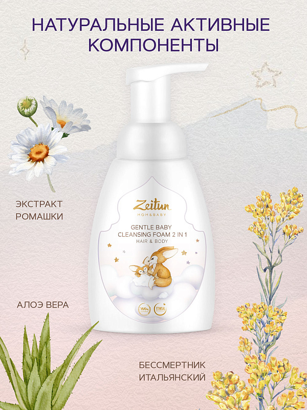 Нежная очищающая пенка 2 в 1 Zeitun Mom&Baby с нейтральным рН бережно очищает волосы и кожу без сухости и раздражения, защищает кожу от жесткой воды во время купания, а также помогает мягко удалить корочки на голове новорожденного. Мягкая гипоаллергенная аромакомпозиция успокаивает малыша и нормализует сон. Инновационные фитоэндорфины улучшают состояние кожи и способствуют здоровому развитию ребенка с первых дней жизни.