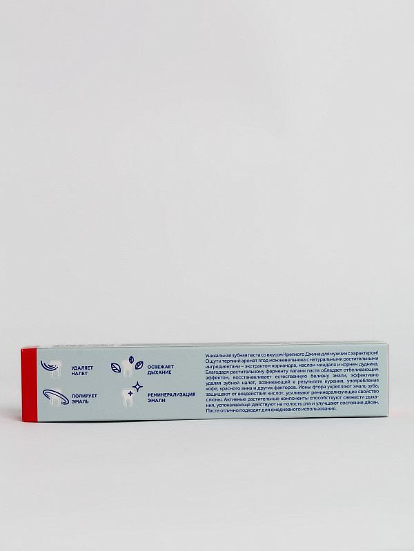 Уникальная зубная паста для настоящих мужчин! Ощути терпкий аромат ягод можжевельника с натуральными растительными ингредиентами - экстрактом кориандра, маслом миндаля и корнем дудника. Благодаря растительному ферменту папаин паста обладает отбеливающим эффектом, восстанавливает естественную белизну эмали, эффективно удаляя зубной налет, возникающий в результате курения, употребления кофе, красного винаи других факторов.