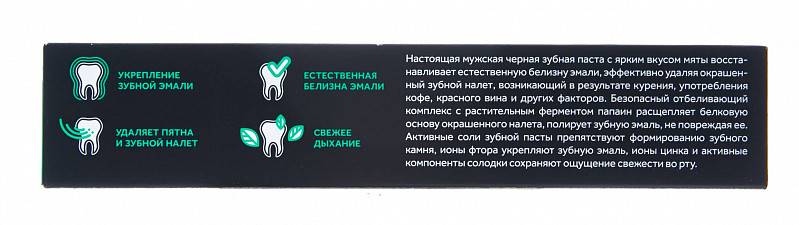 Настоящая мужская черная зубная паста с ярким вкусом мяты восстанавливает естественную белизну эмали, эффективно удаляя окрашенный зубной налет, возникающий в результате курения, употребления кофе, красного вина и других факторов.