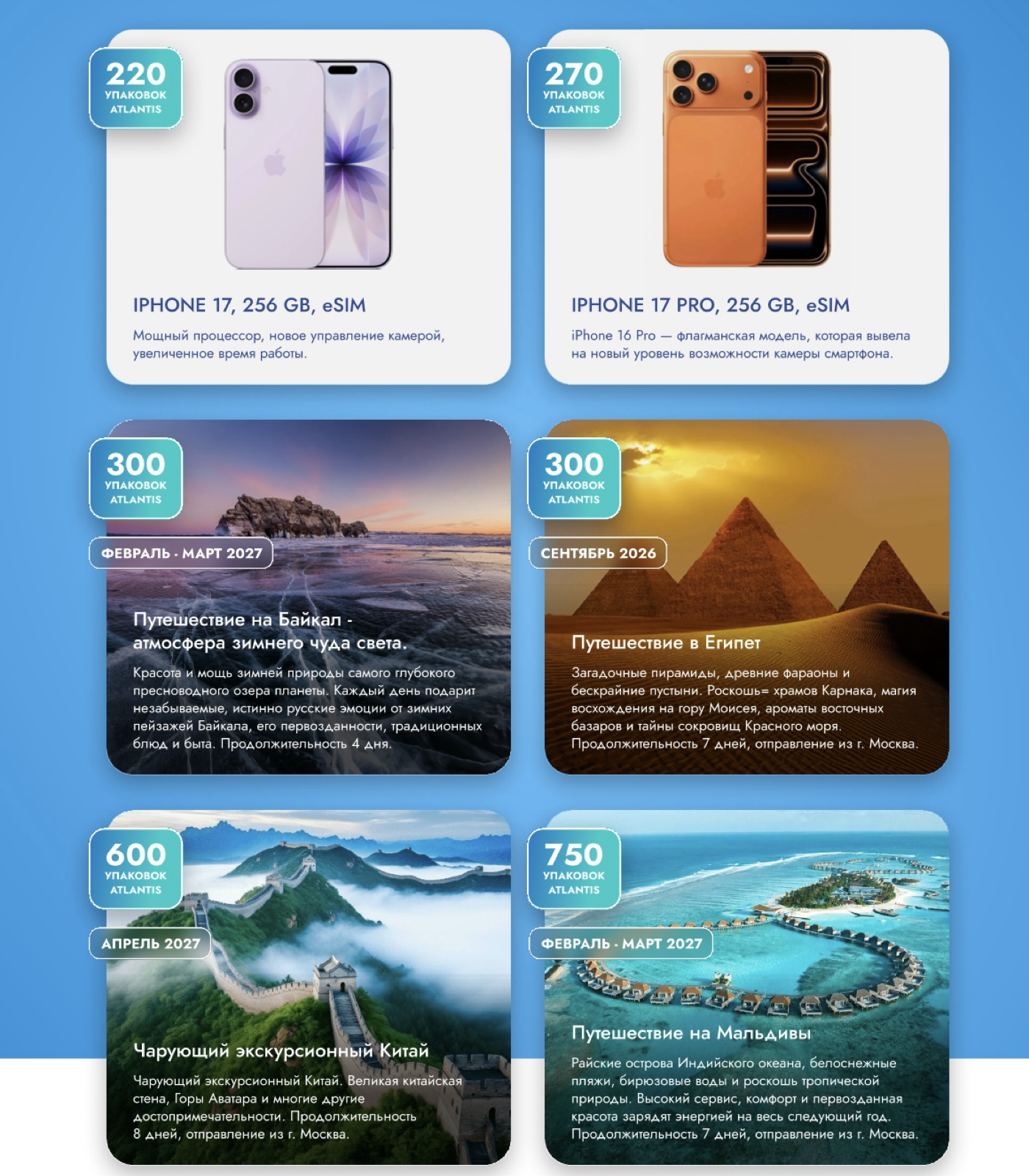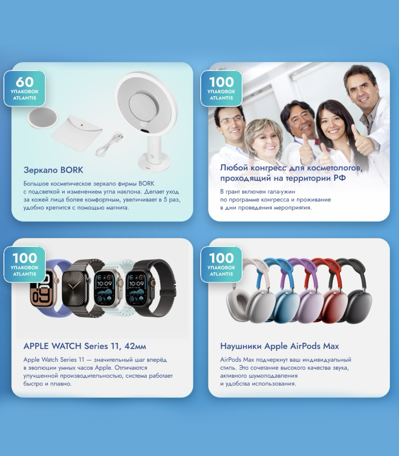Представляем вашему вниманию гранты от компании ATLANTIS на 2026 год. Под закупку препаратов бренда Вы можете получить Iphone, билет на любой конгресс, проходящий на территории РФ, путешествие и многое другое.
