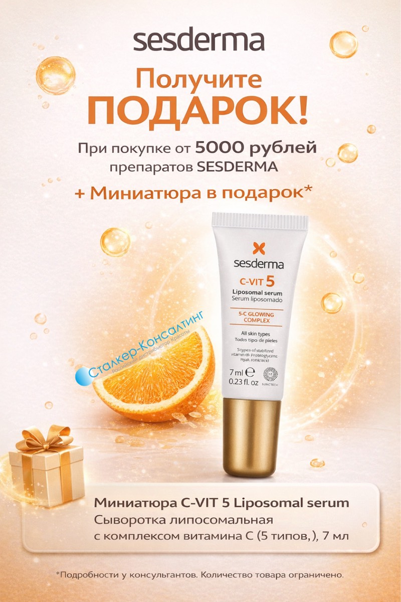 При покупке препаратов SESDERMA от 5000 рублей вы получите в подарок Миниатюру C-VIT 5 Liposomal serum - Сыворотка липосомальная с комплексом витамина С (5 типов), 7 мл